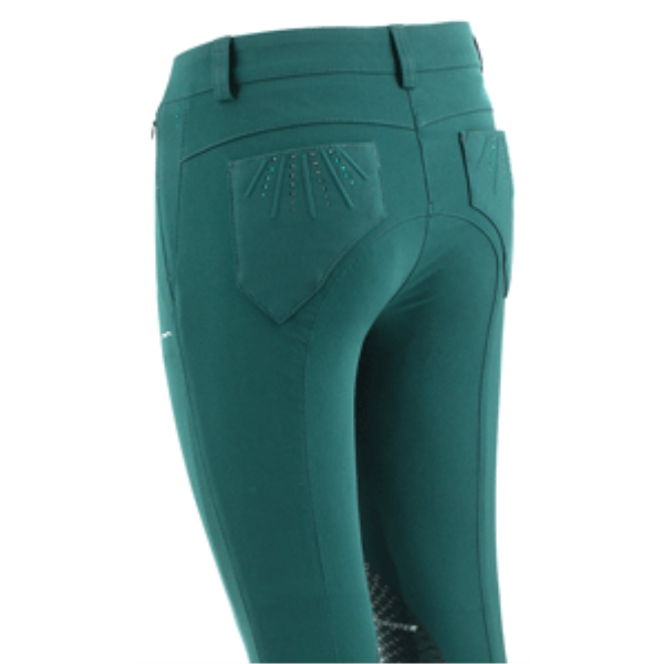 前の左右にはファスナー付のポケットにスワロフスキーがあり、後ろの左右はポケットに縦に3本のスワロフスキーがあります。